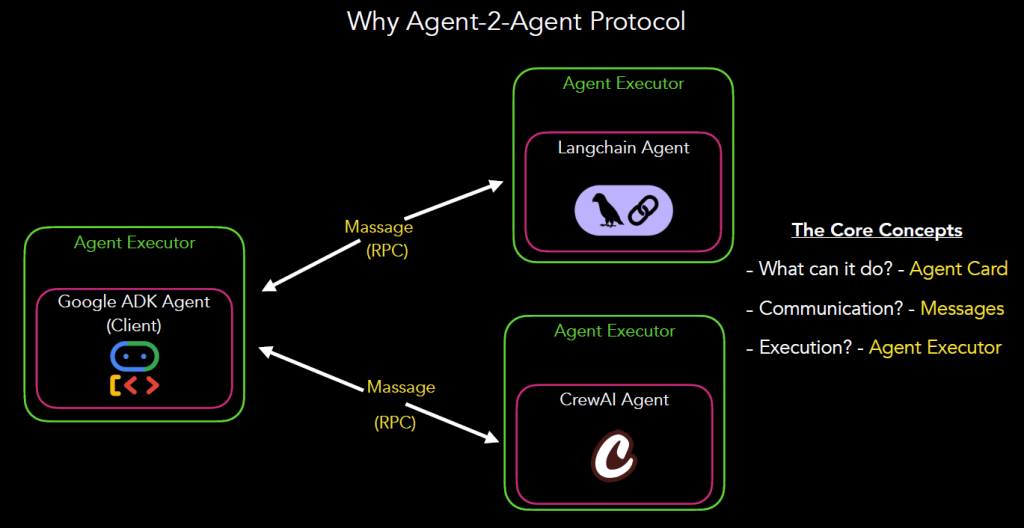 1. What is the Agent-to-Agent (A2A) protocol? The Agent-to-Agent (A2A) protocol is a new, open-source, standardized way for AI agents to communicate. Think of it as a universal language (based on JSON RPC) that allows agents built on different frameworks (like Google’s ADK, CrewAI, etc.) to collaborate, much like how microservices talk to each other. It was created by Google, Microsoft, and Amazon to solve the problem of AI systems being “locked in” to a single framework.
