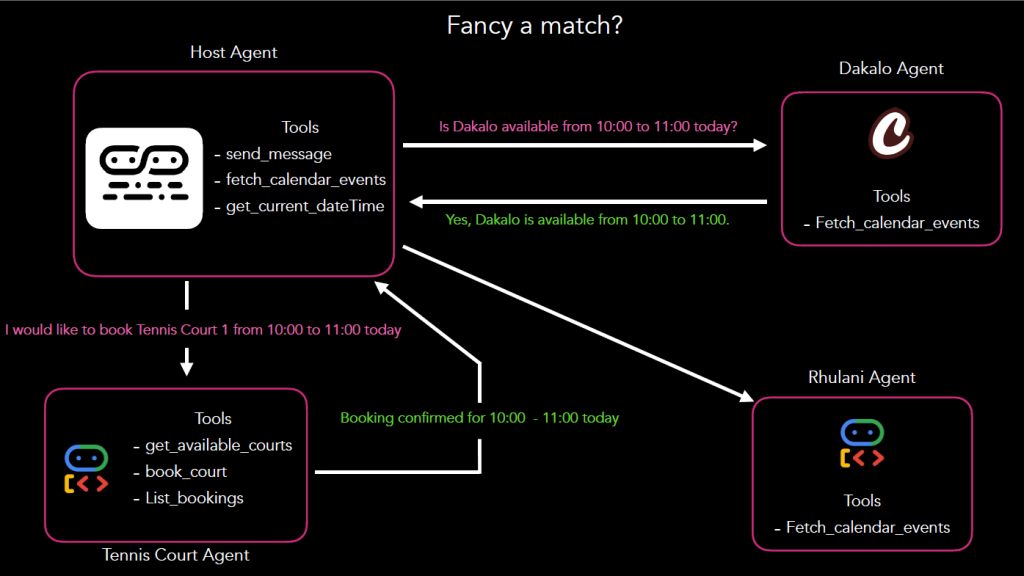 This architecture allows agents built with different technologies (Google ADK and CrewAI) to collaborate seamlessly to book the tennis match, with the final booking confirmed in a MongoDB.